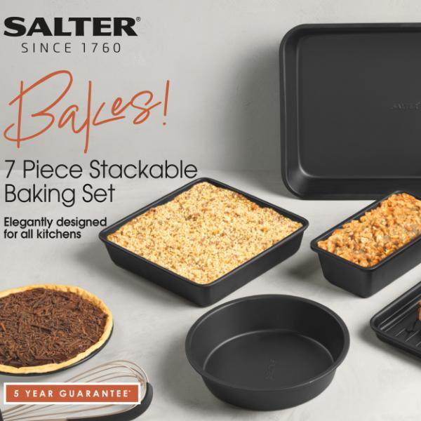- This Salter Bakes 7 Piece Stackable Bakeware Set neatly fits together for convenient storage and has a black finish to look great in your kitchen.