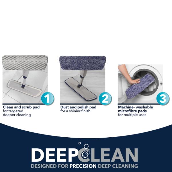- For optimum efficiency, this spray mop includes a scrubbing pad for tackling deeper cleaning and a polishing pad for a glossy finish.