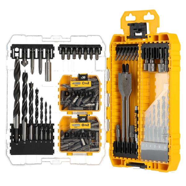 - The set includes 24 1" PH bits, 16 1" SQ bits, 12 1" SL bits, 4 1" STAR bits, 19 2" power bits, 6 3-1/2" bits, 3 nut drivers (1/4", 5/16", 3/8"), a compact magnetic drive guide, a magnetic bit tip holder, and 14 gold ferrous drill bits.
