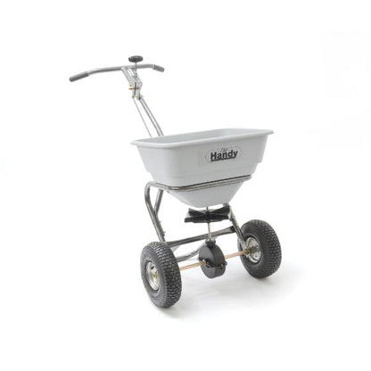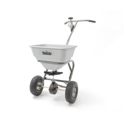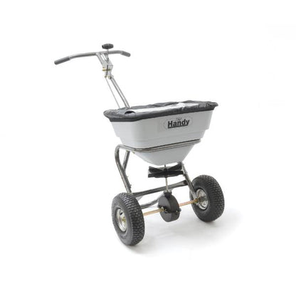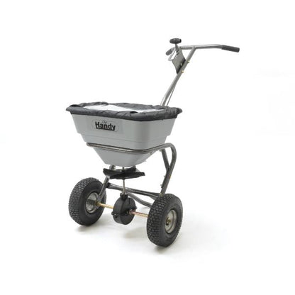 - Featuring robust metal gearing and combining a spacious 32kg-capacity hopper with an impressive 3.66m spread-width (max.), this heavy-duty broadcast spreader from Handy excels in terms of durability and large-area work-rate. Attractive features include a comfortable T-bar handlebar; stability-optimising pneumatic tyres; and a flexibility-enhancing adjustable feed-control. Weighs-in at just 10.9kg.