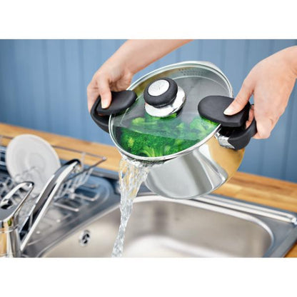 - Draining with ease: double sided draining lid, also allows for adjustable steam release