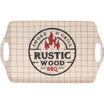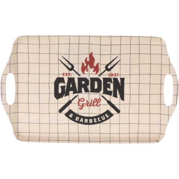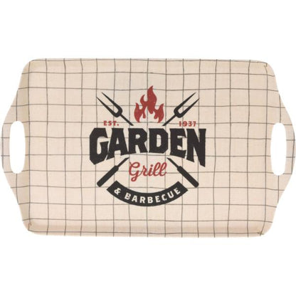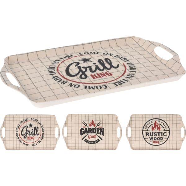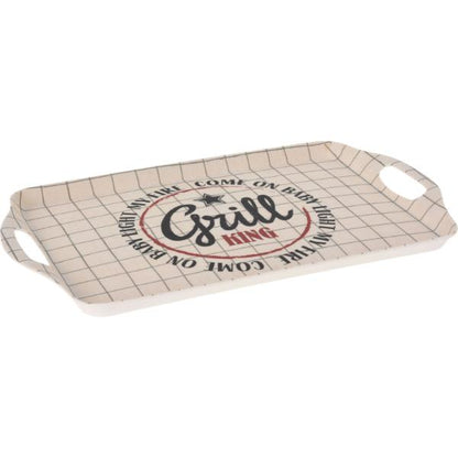 - The Melamine Serving Tray measures approximately 38 cm x 23 cm and comes in three assorted designs.