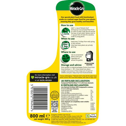 - Miracle-Gro® All Purpose Concentrated Liquid Plant Food helps your plants grow twice as big compared to unfed plants. It’s like superfood for your green friends!