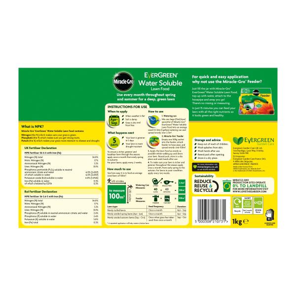 - Mix one large (15ml) level spoonful of Miracle-Gro Water Soluble Lawn Food into an average-sized 4.5-liter watering can and spread it evenly over 2.5m². Empty one 500g sachet into the feeder, attach it to a hose pipe, and spread it evenly over 100m².