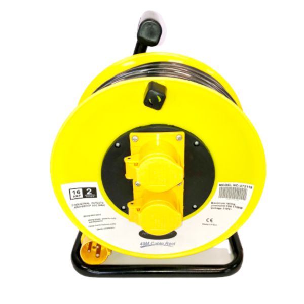 Rugged 40mtr 16Amp 110Volt 2 Socket Cable Reel Yellow