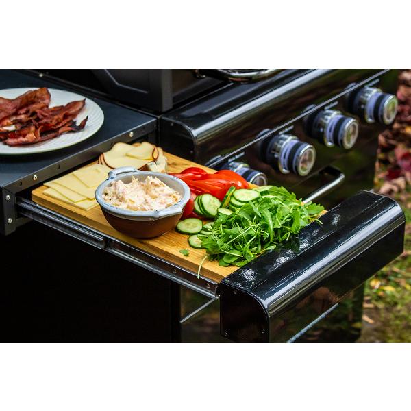 - Slide out side shelf drawer with integrated chopping board for extra prep space. Also included is a towel and utensil rail on side shelf