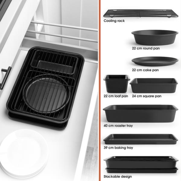 - This Salter Bakes 7 Piece Stackable Bakeware Set neatly fits together for convenient storage and has a black finish to look great in your kitchen.
