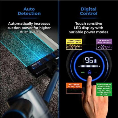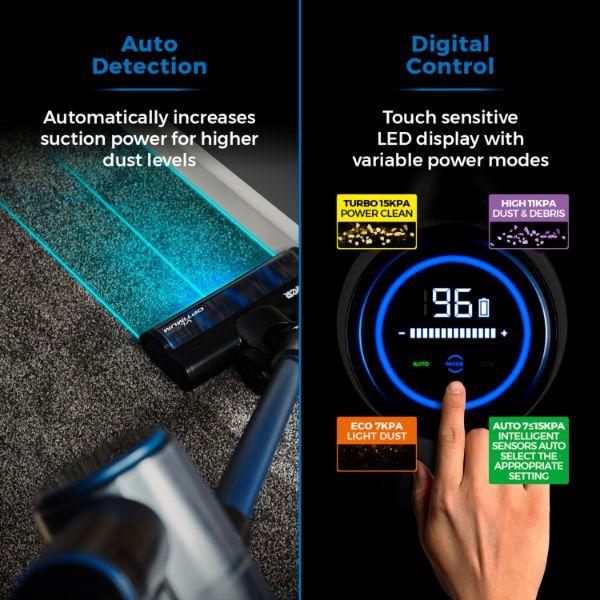- Touch sensitive LED display with 4 power modes, including auto suction mode. Dust sensor technology continuously detects dust particles, automatically increasing suction power for higher dust levels with the LED display showing up hidden dust and debris