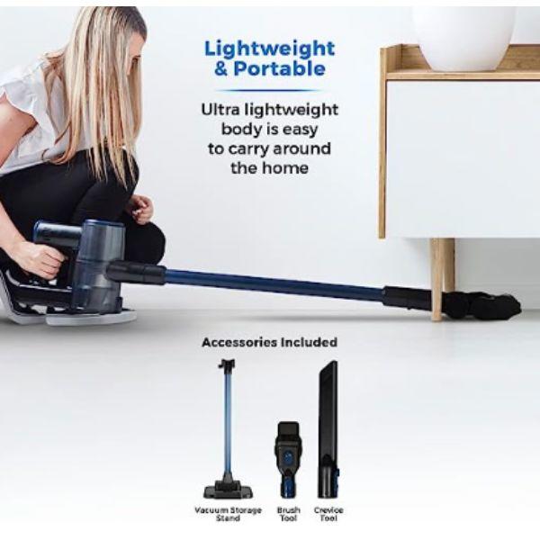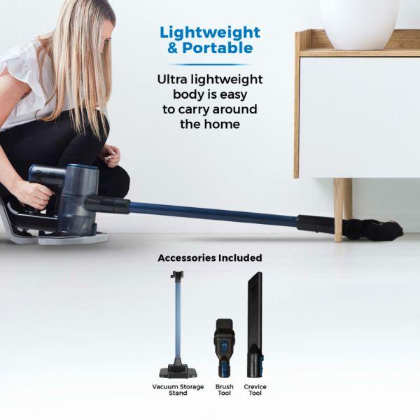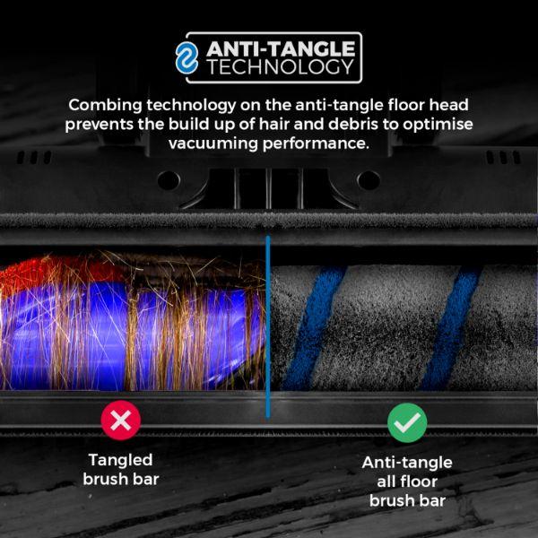 - Ultra-efficient floor head agitates dust and dirt complete with anti-tangle technology, preventing hair build up around the brush bar. Accessories include a 2-in-1 Upholstery tool and a crevice tool. The filter removes 99.95% of fine particles down to 0.3 microns to help those with allergies and helping to promote a healthier environment to live in