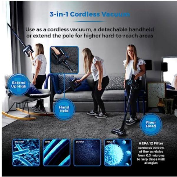 - Use as a cordless vacuum, a detachable handheld or use the pole for higher hard-to-reach areas. Ideal for carpets and hard floors. Use as a detachable handheld for cars, stairs and upholstery or employ the pole for hard-to-reach areas like ceilings & curtains, as well as under furniture