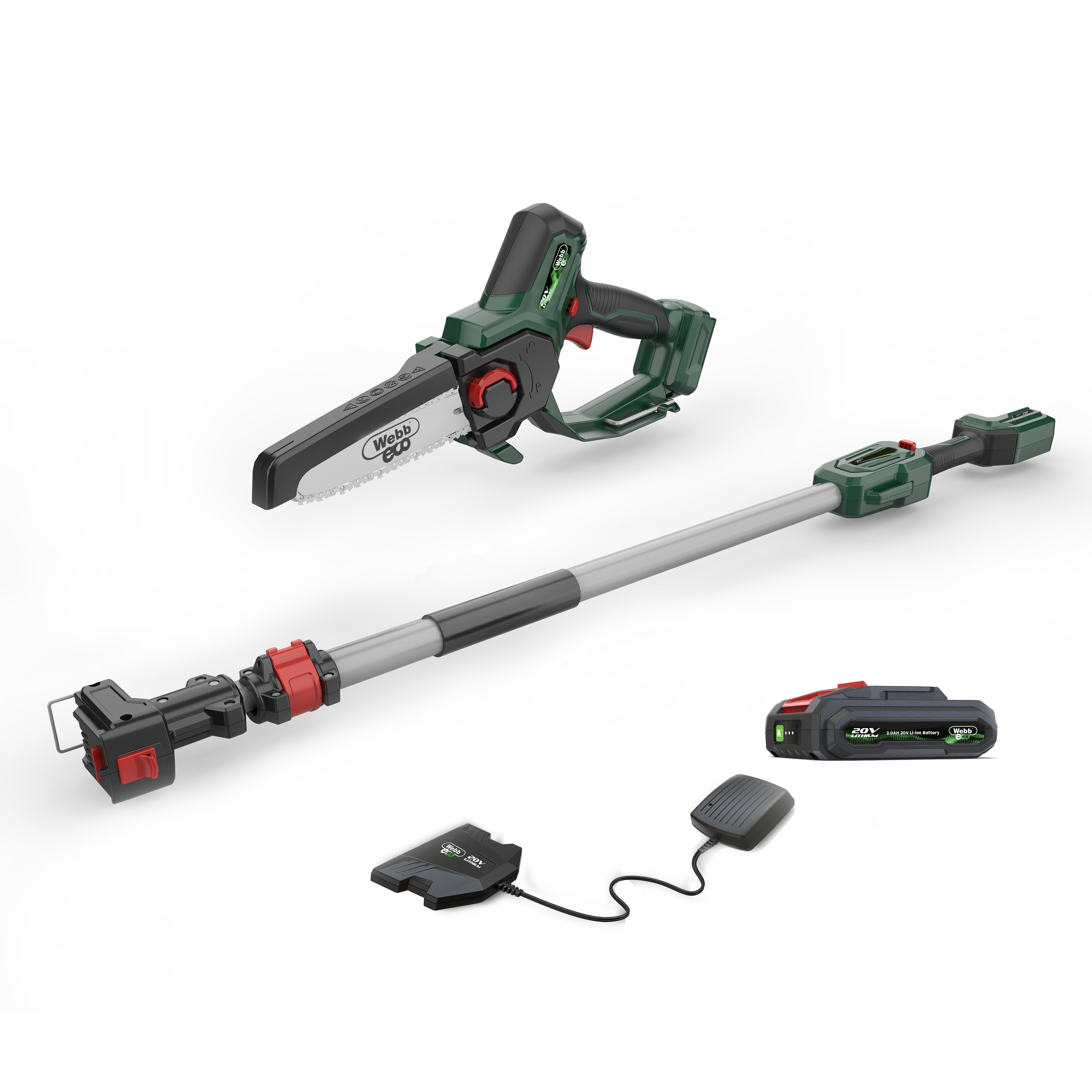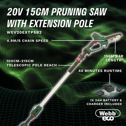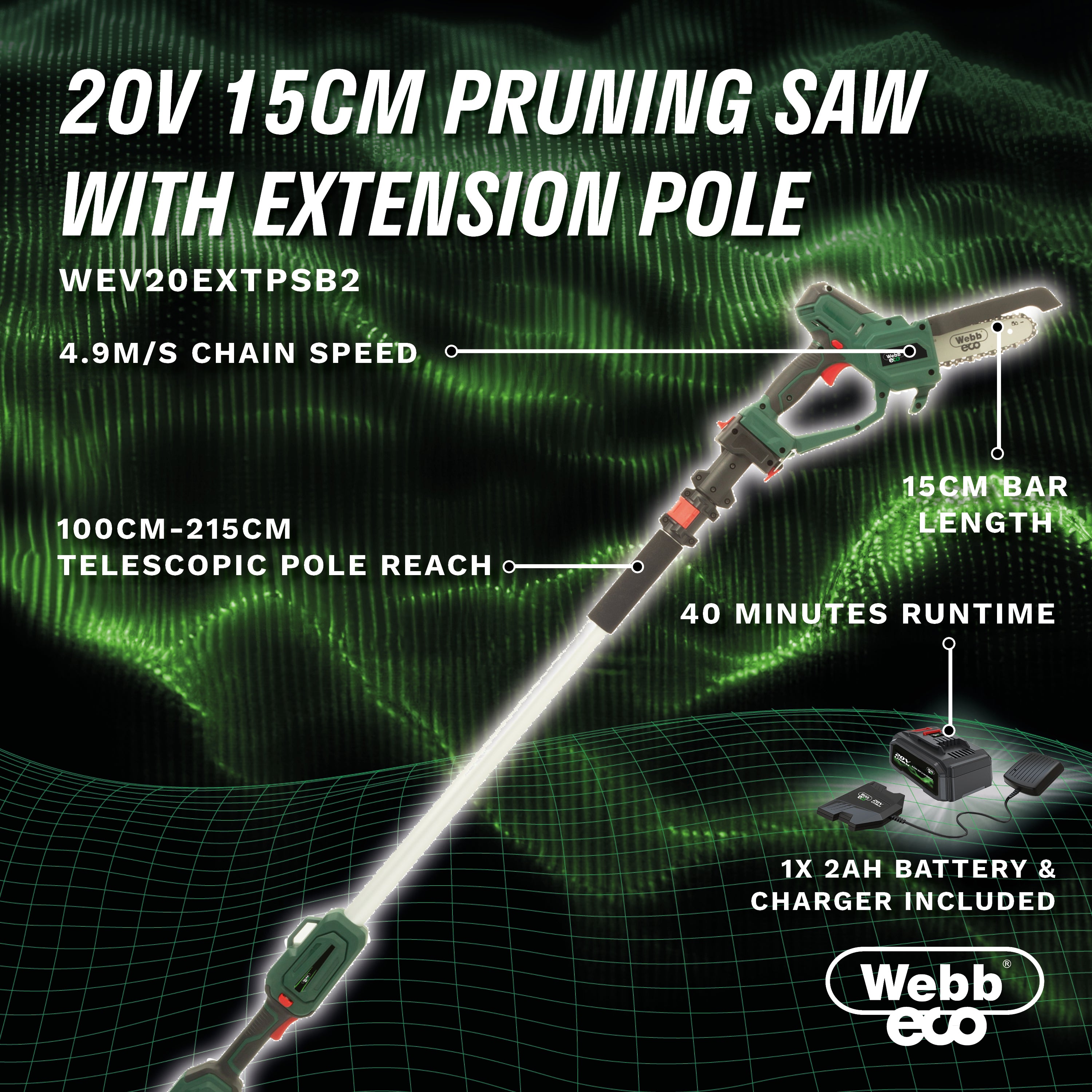 Webb 20v Eco Cordless 15cm Pruning Saw extension pole with 1 x 2ah battery & charger