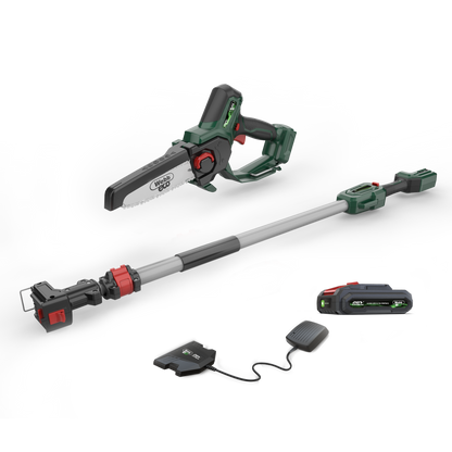 - Powered by a 20V 2Ah battery, this cordless pruning saw offers up to 40 minutes of uninterrupted runtime, allowing you to accomplish more on a single charge.