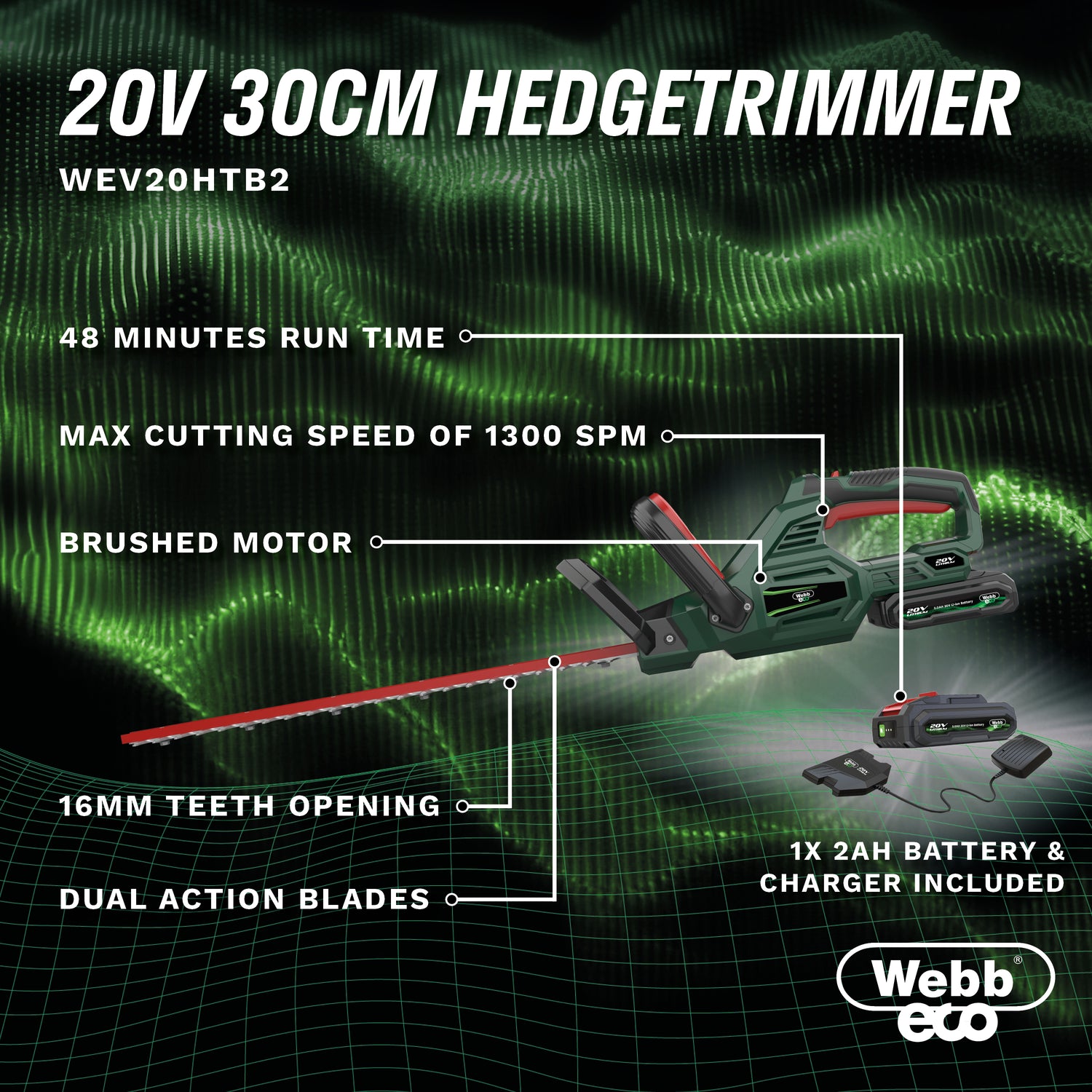 Webb Eco 20v Cordless 50cm Hedge Trimmer with 1 x 2ah battery & charger