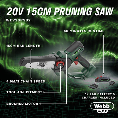 Webb Eco 20v Lithium Cordless 15cm Pruning Saw with 1 x 2ah battery & Charger