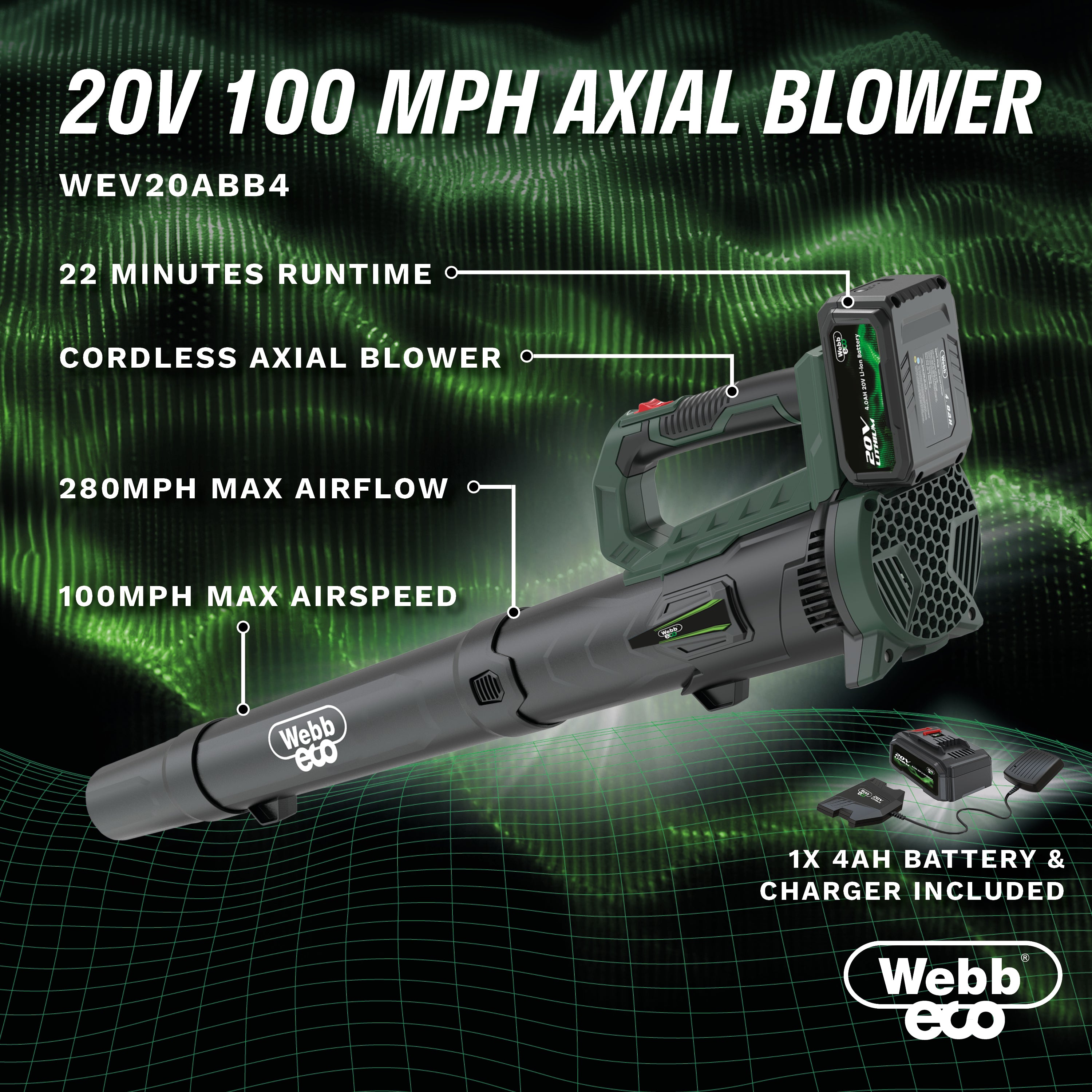 Webb Eco 20v Lithium Cordless 160km/h Axial Blower with 1 x 4ah battery & charger